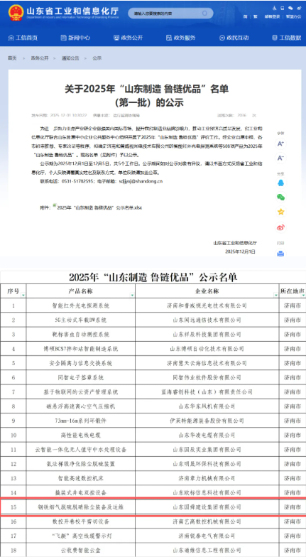 日前,山东省工业和信息化厅正式公布了2025年“山东制造 鲁链优品”第一批名单。优德88集团“钢铁烟气脱硫脱硝除尘装备及运维”成功上榜,充分展现了优德88集团的硬核技术实力与卓越服务品质,为引领行业高质量发展树立了标杆典范。