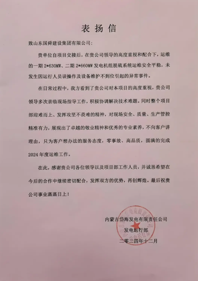 近日,山东优德88岱海运维项目团队荣获内蒙古岱海发电有限责任公司颁发的“安全生产运营先进单位”荣誉牌匾、锦旗和表扬信,体现出客户对项目团队工作的充分认可和高度赞扬。 内蒙古岱海发电有限责任公司一期2×630MW、二期2×660MW燃煤发电机组脱硫系统采用石灰石-石膏湿法工艺,可以在0-100%BMCR工作容量范围内长期安全稳定运行,系统出口二氧化硫、氮氧化物、烟尘排放浓度远低于35mg/Nm3、50mg/Nm3、10mg/Nm3超低排放限值,该项目有力推动了岱海发电的绿色发展,对于优德88实现发电领域业务新拓展具有重要意义。 山东优德88岱海运维项目团队将以此为契机,锚定“快速响应客户需求,实现可持续发展”的发展目标,继续坚持“精准、经济、精致”的管理理念,以更加专业的技能、更加优质的服务和更加饱满的热情,书写携手奋进、共生共赢崭新篇章!