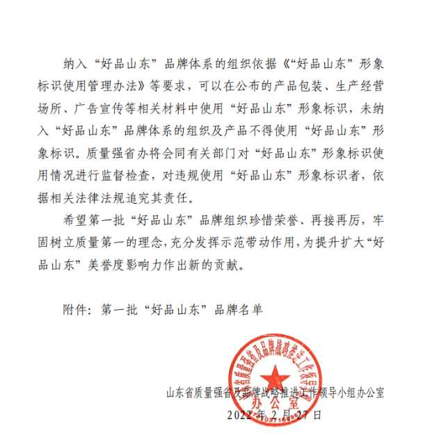 关于发布第一批“好品山东”品牌的公告